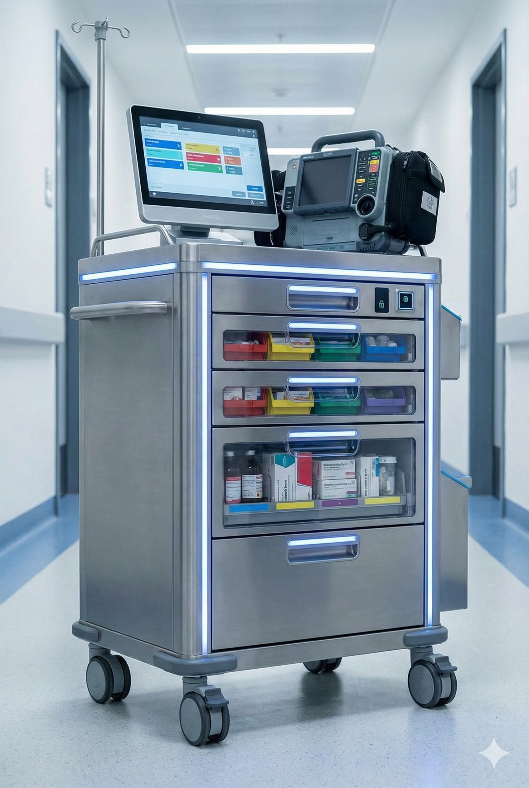 Multi-drawer emergency cart for quick access to emergency medications and equipment.