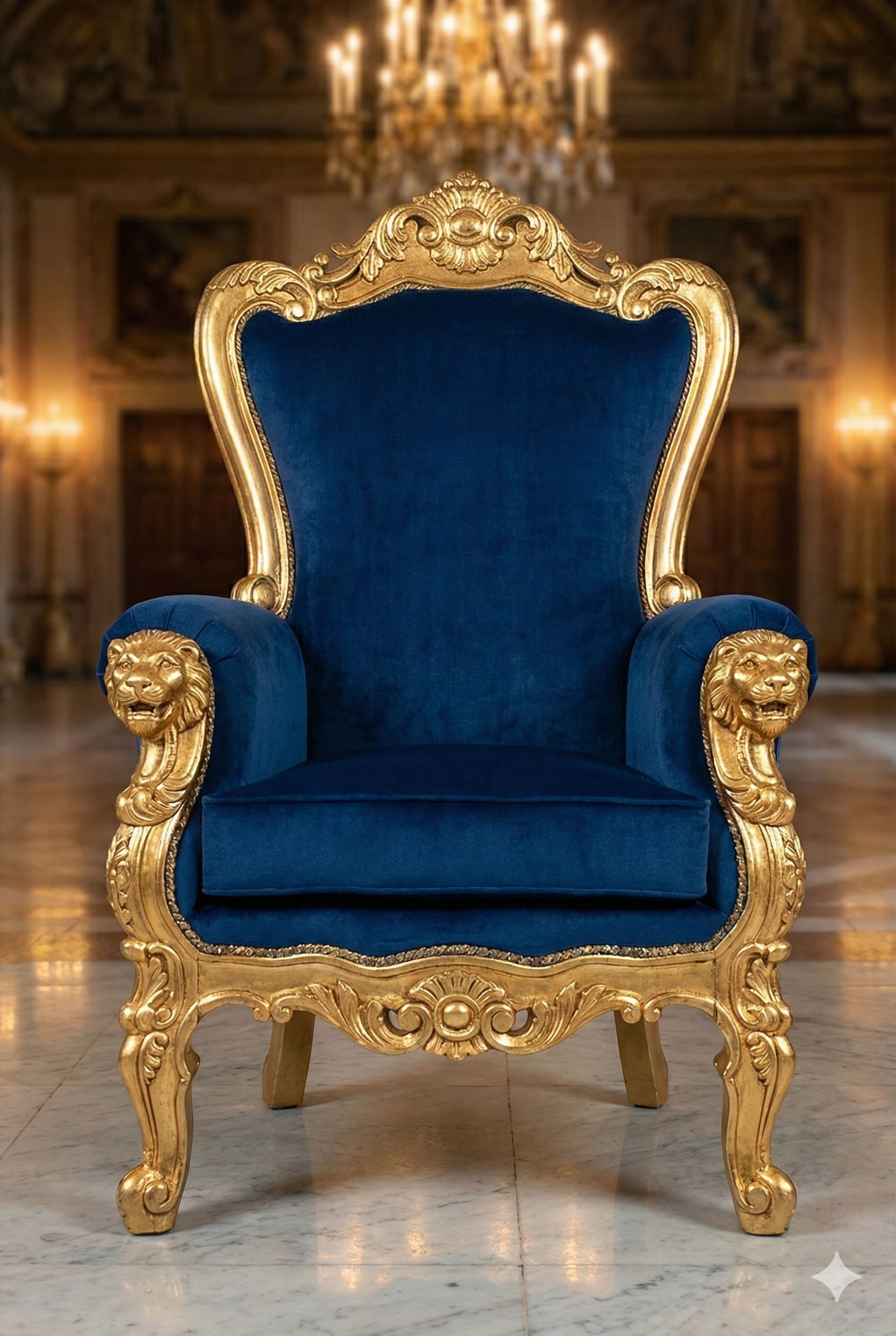 Plush velvet throne with gold-leaf carvings and jewel detailing.