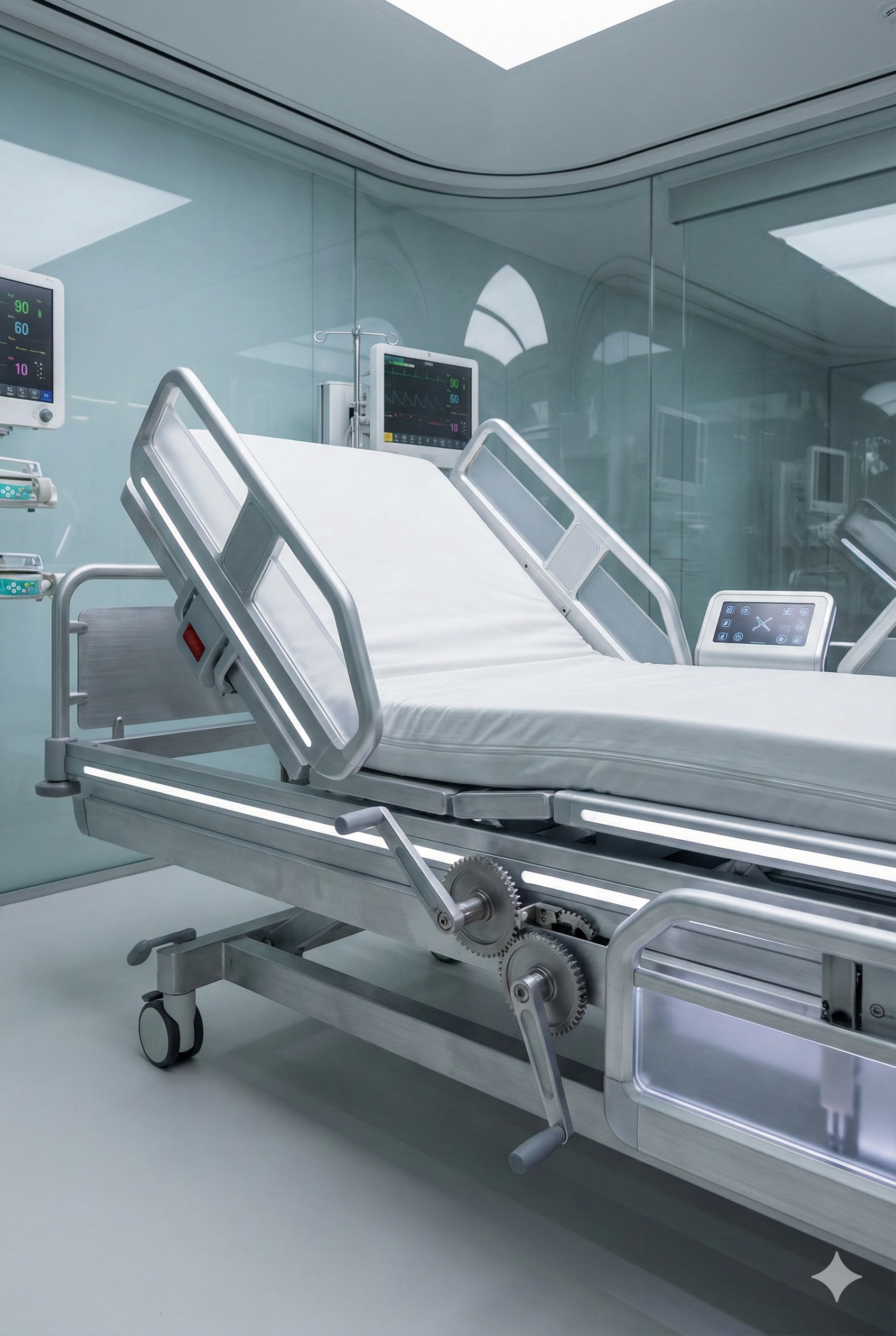 Sturdy semi-fowler patient bed with manual height adjustment and side rails — ideal for general wards and recovery rooms.